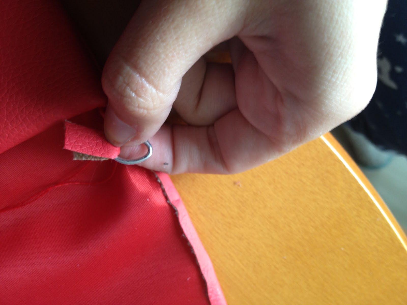 Para sujetar las arandelas donde engancharemos la cadena, vamos a coser en los extremos dos pequeñas tiras de piel